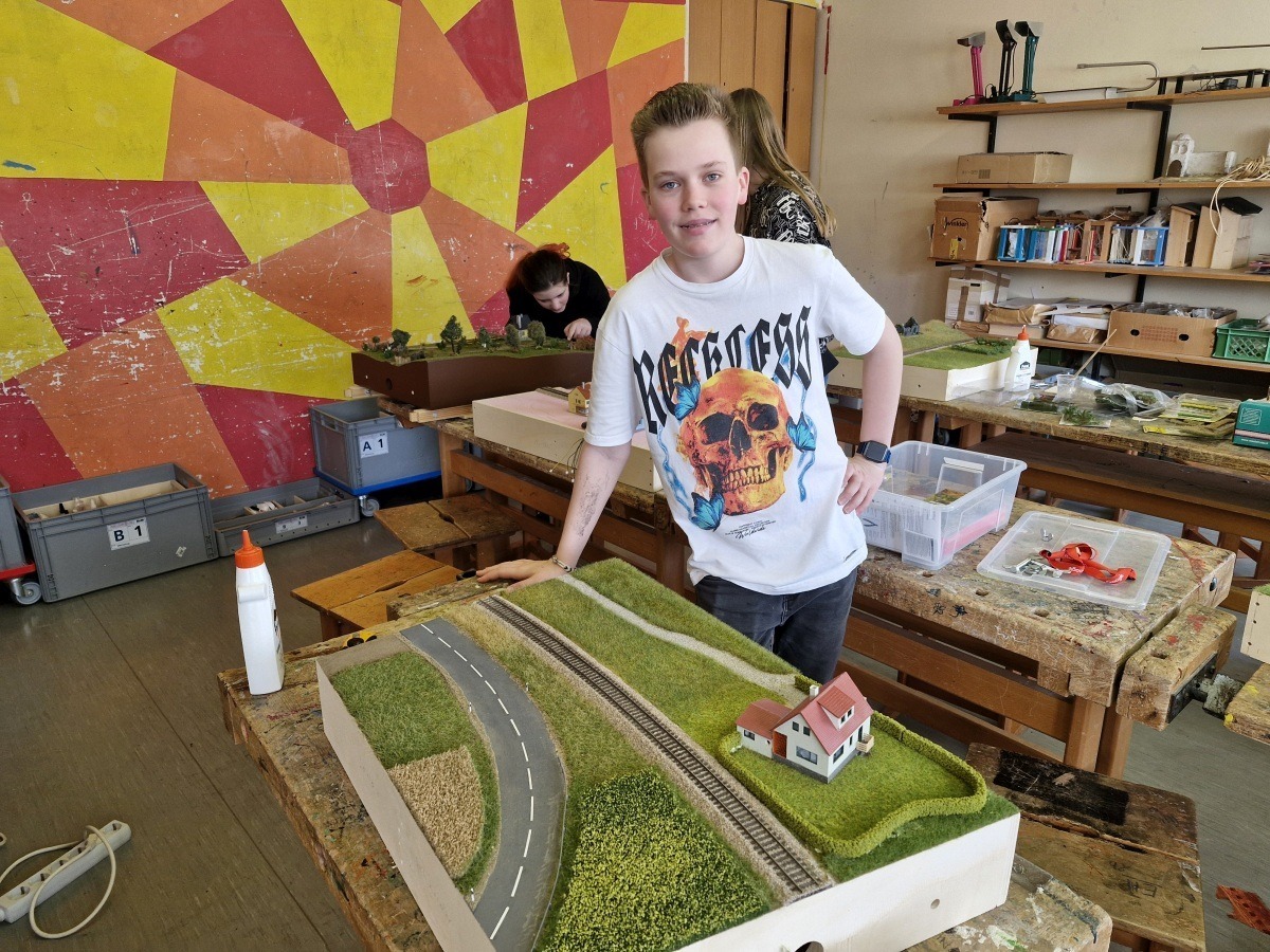 Die Schülerinnen und Schüler überlegen sich gruppenweise, wie ihr Modellbahnabschnitt grundsätzlich gestaltet werden soll: eher flach, hügelig, mit Flussüberquerungen, Spielplätzen, Häuserzeilen und vieles mehr. Dann arbeitet jeder Einzelne an einem 70 cm langen Bogen- oder Geradenmodul.